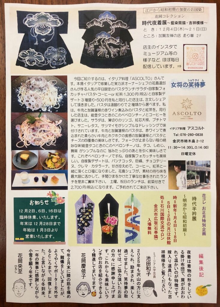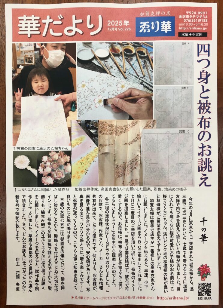 早いもので、今年最後の華だよりです。12月号は、加賀友禅で四つ身と被布のお誂えのお話し。華だより初めての、次号に続く2部作になります。それだけ素晴らしいお誂えをさせて頂きました。